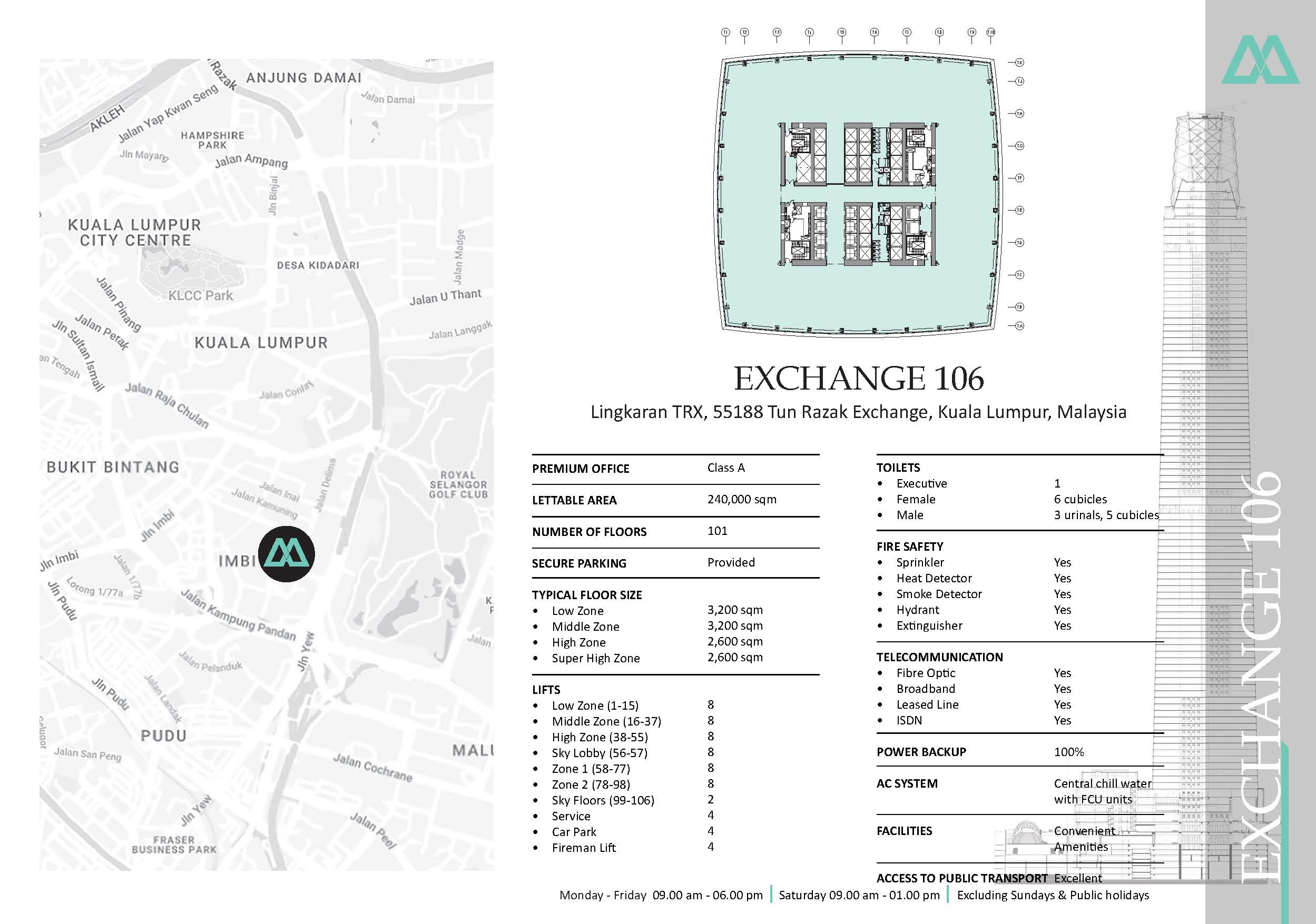 The Exchange 106 is a 453.6m skyscraper centerpiece of Kuala Lumpur's Financial Quarter and the focal point of the 29 hectares Tun Razak Exchange master plan. Situated at the edge of a 5 hectares public park in the bustling Central Business District, the tower acts as an extension of the Golden Triangle - the city's commercial, entertainment, and shopping belt.