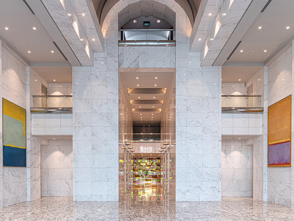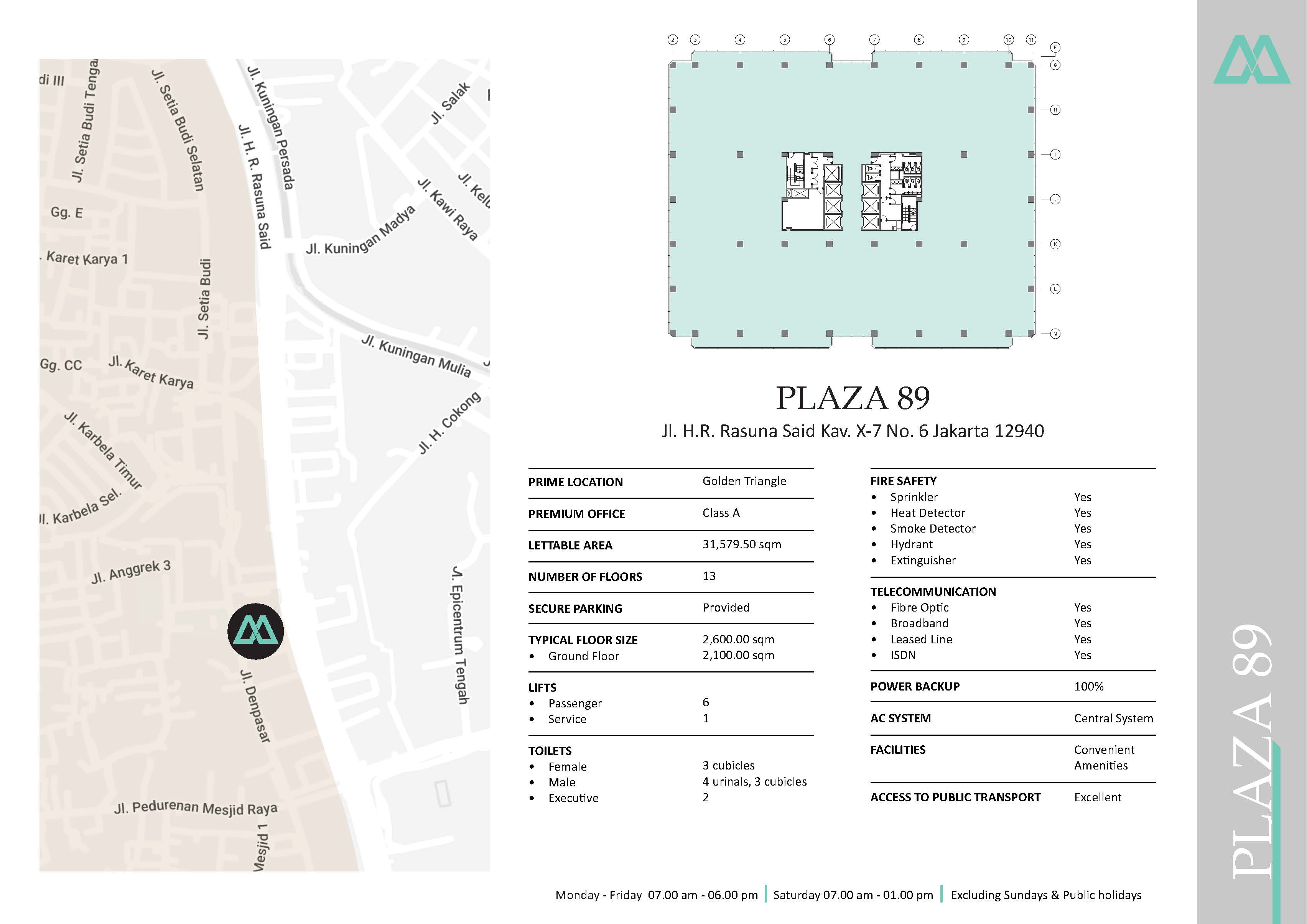 The 13-story structure, with its appealing green tinted reflecting glass curtain walls was completed in 1990. Plaza 89 was the first Mulialand property to include a vaulted ceiling 13 meters high in its main entry lobby, which became a standard feature in later Mulialand buildings.