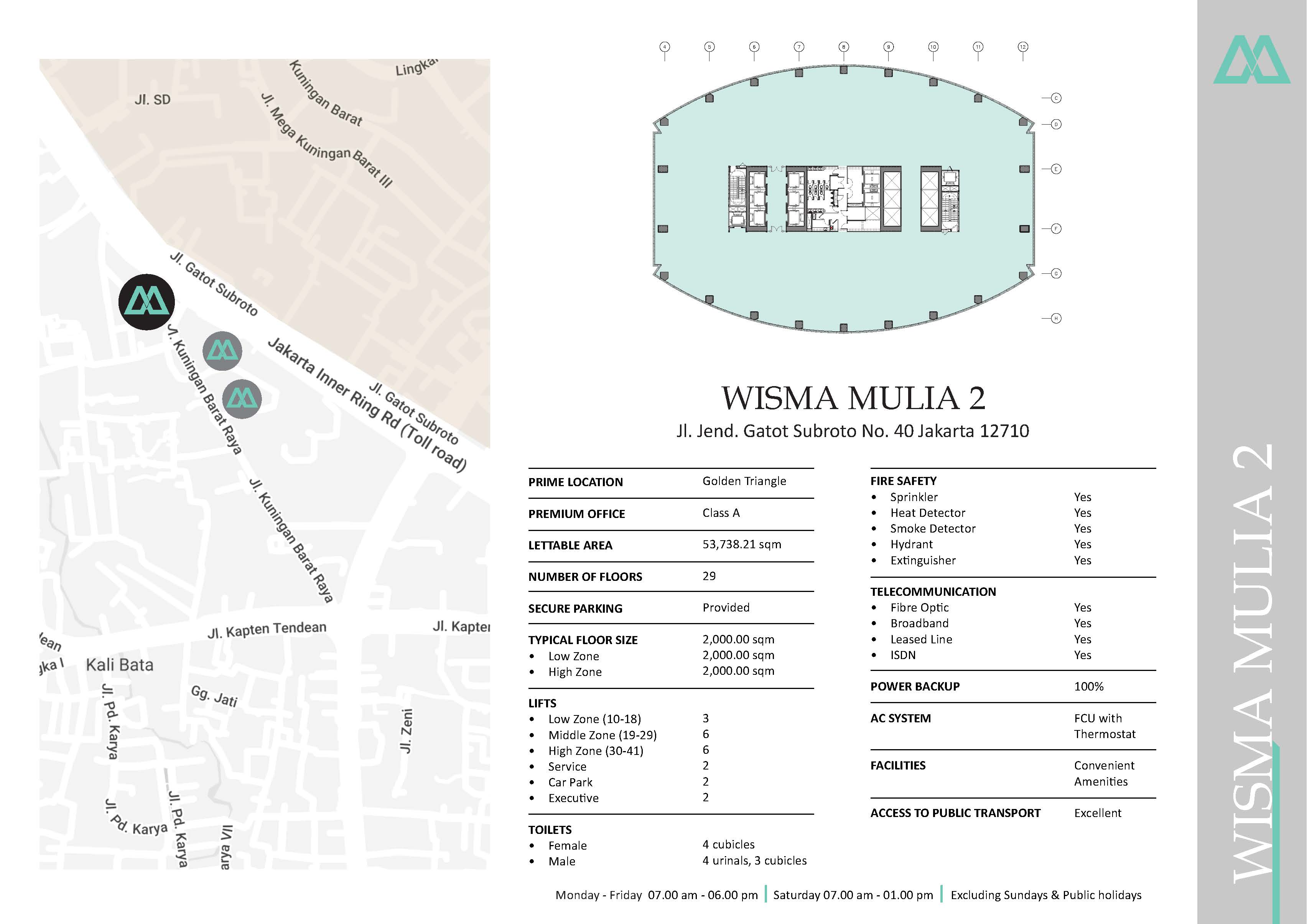 Wisma Mulia 2 adjoins Wisma Mulia 1 and City Plaza. Together this complex of structures provides extensive office, banking and restaurant facilities.